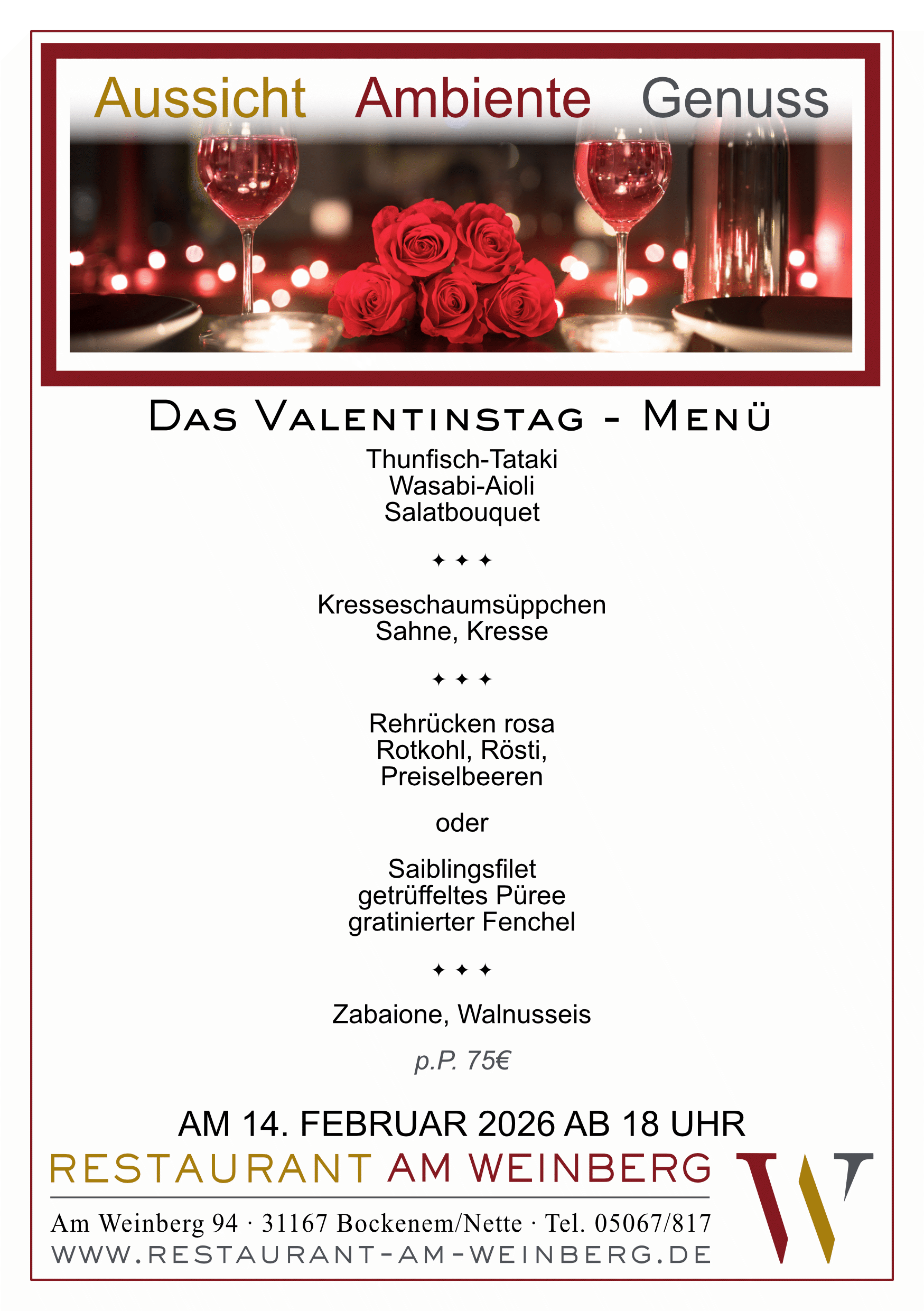 Feiern Sie den Valentinstag am 14. Februar ab 18 Uhr bei uns am Weinberg. Unser